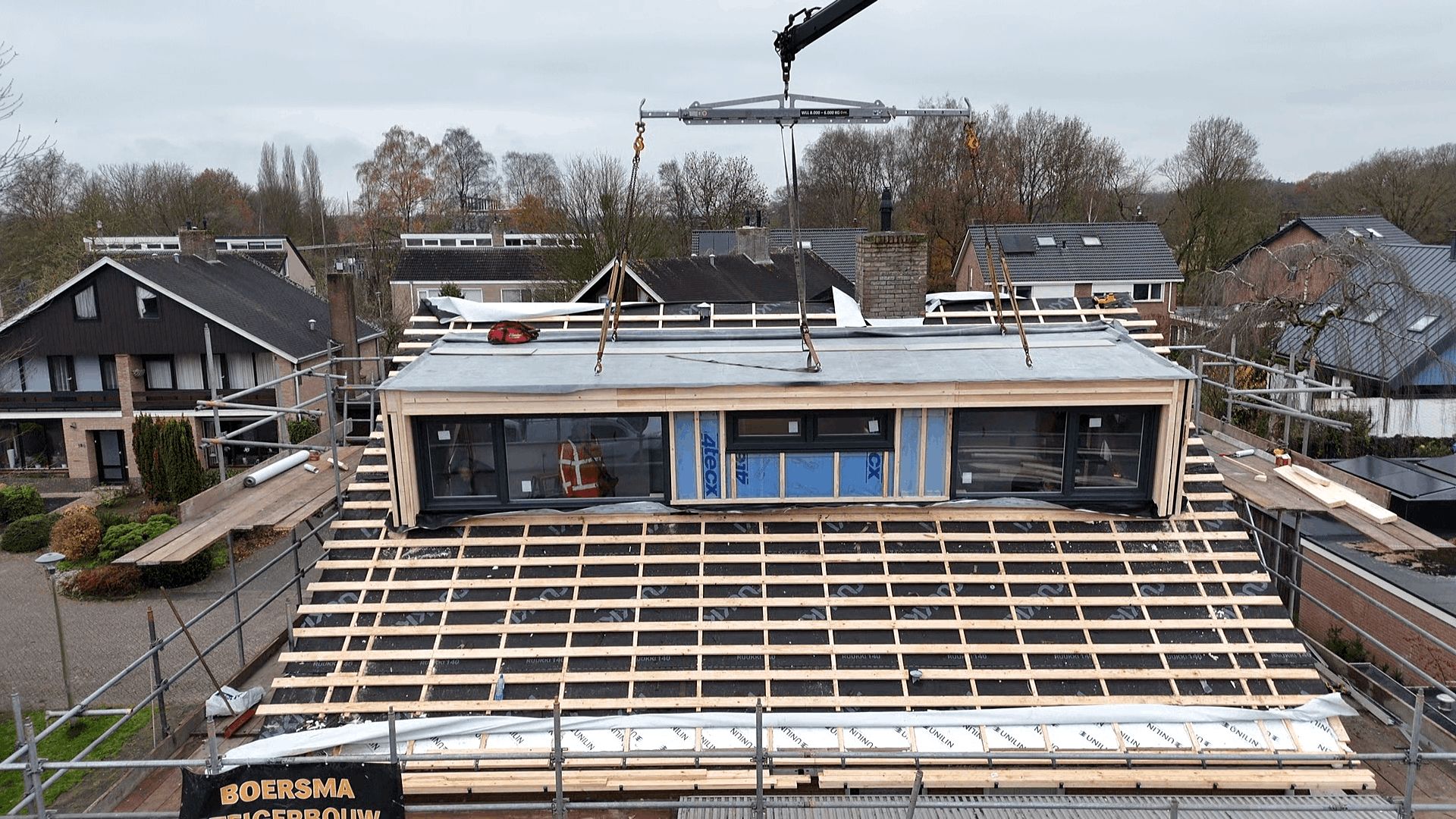 Voor dit project is gekozen voor Ruukki Classic felsbanen type C (vlak) 475 mm. De vlakke uitvoering zorgt voor een moderne, minimalistische uitstraling waarbij de lijnen volledig tot hun recht komen.