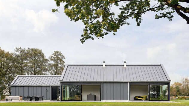 In het mooie Baarn is een gloednieuwe moderne houtskeletbouw woning gebouwd met door Barentsz Ontdekkingshuizen. Als trotse vaste leverancier van stalen felsbanen hebben wij de Ruukki Classic Felsbanen mogen monteren waardoor wij ons steentje hebben bijgedragen aan dit project.
