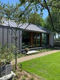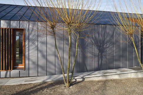 Het dak en de gevel vormen een mooi geheel, waarbij de strakke lijnen van de Classic felsbanen mooi samensmelten. En alsof dat nog niet genoeg is, hebben we het ontwerp van het gebouw laten doorlopen naar de buitenopeningen van de woning, waardoor er een hedendaags geheel ontstaat. Je kunt gerust zeggen dat we hier een strakke, architectonisch verfijnde woning hebben neergezet.